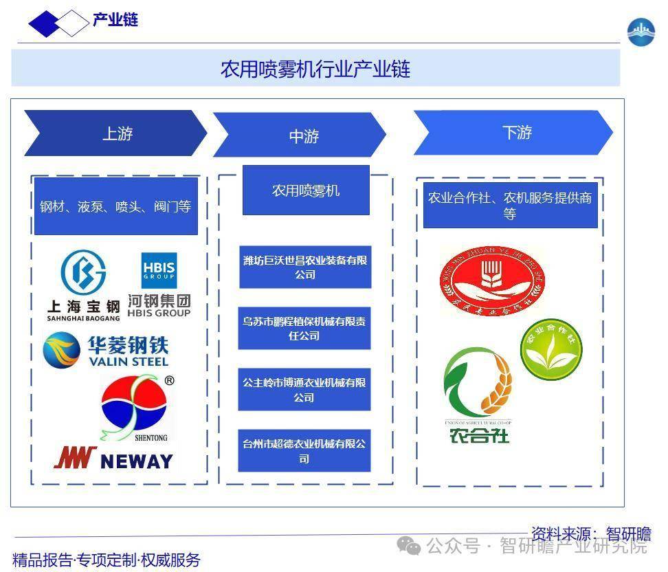 中国农用喷雾机产业的产业链结构涵盖了上下游两大部分。在上游领域,主要负责提供关键原材料和零部件,包括钢材、液泵、喷头以及阀门等等,这些都是由对应的知名钢铁厂及零部件制造企业所提供;而在中游环节,我们可以看到各个农机制造商的身影,他们在接收上述原材料及零部件之后,便开始对其进行深度加工与精妙制作,最终铸就成了适合实际农业生产需要的农用喷雾机产品;在下游方面,则主要涉及到众多农业合作社、农机服务提供商以及农药和化肥生产商等单位,他们纷纷采购并投入使用这些高性能的喷药机,以满足日益增长的农业生产服务需求。