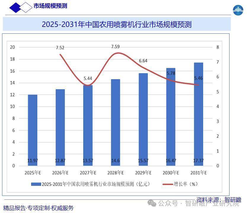预测,受中国农用喷雾机行业市场需求的增长,2025-2031年中国农用喷雾机行业市场规模平稳上升。2031年中国农用喷雾机行业市场规模17.37亿元。2025-2031年中国农用喷雾机行业市场规模预测如下: